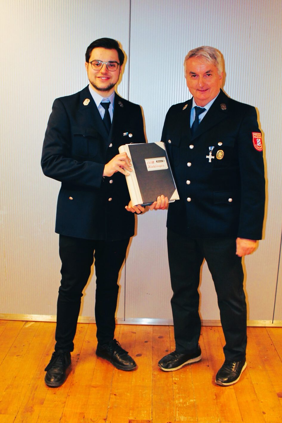Der neu gewählte Schriftführer Noah Spengler nimmt von seinem Vorgänger Willibald Breindl das „Feuerwehr-Buch“ entgegen. 40 Jahre lang wurde es von Willi sorgfältig geführt.