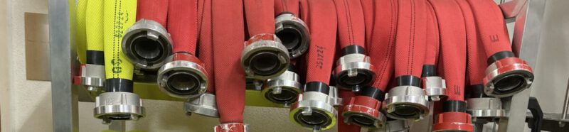Ein Regal, gefüllt mit Feuerwehrschläuchen unterschiedlicher Größen und Farben (gelb und rot)